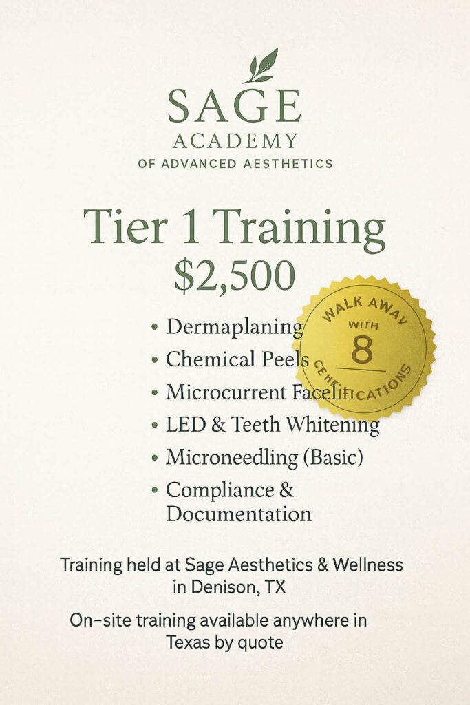 All standard training is conducted on-site at Sage Aesthetics & Wellness in Denison, Texas. Private or group on-site trainings can also be quoted anywhere within the State of Texas—ideal for spas and clinics who prefer in-house instruction.